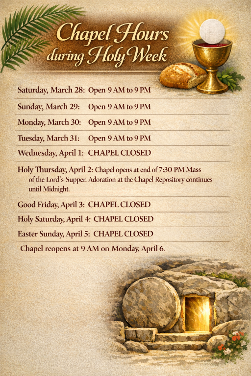 April 3-5, 2026 (Good Friday through Easter Sunday) - Chapel closed; reopens Monday, April 6 at 9 AM (adoration begins at 9:40 AM)