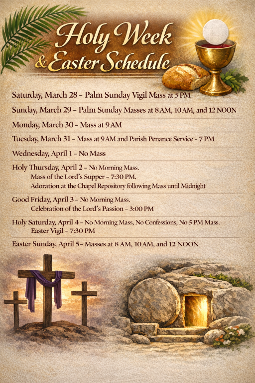 April 2, 2026 (Holy Thursday) - Chapel closed; Adoration begins at end of 7:30 PM Mass and lasts until Midnight